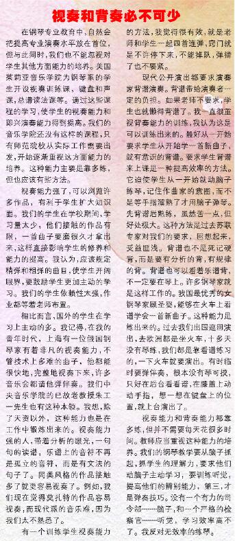 视奏能力和背奏能力都靠多练,但并不需要每天花很多时间。教师应当重视这种能力的培养。我们的钢琴教学要从脑子抓起,抓学生的理解力,要求他们动脑子主动学习,要训练听觉,提高他们的辨别能力,第三,才是弹奏技巧。没有一个有力的司令部——脑子,和一个严格的检察官——听觉,学习效率高不了。我反对无效率的练琴。