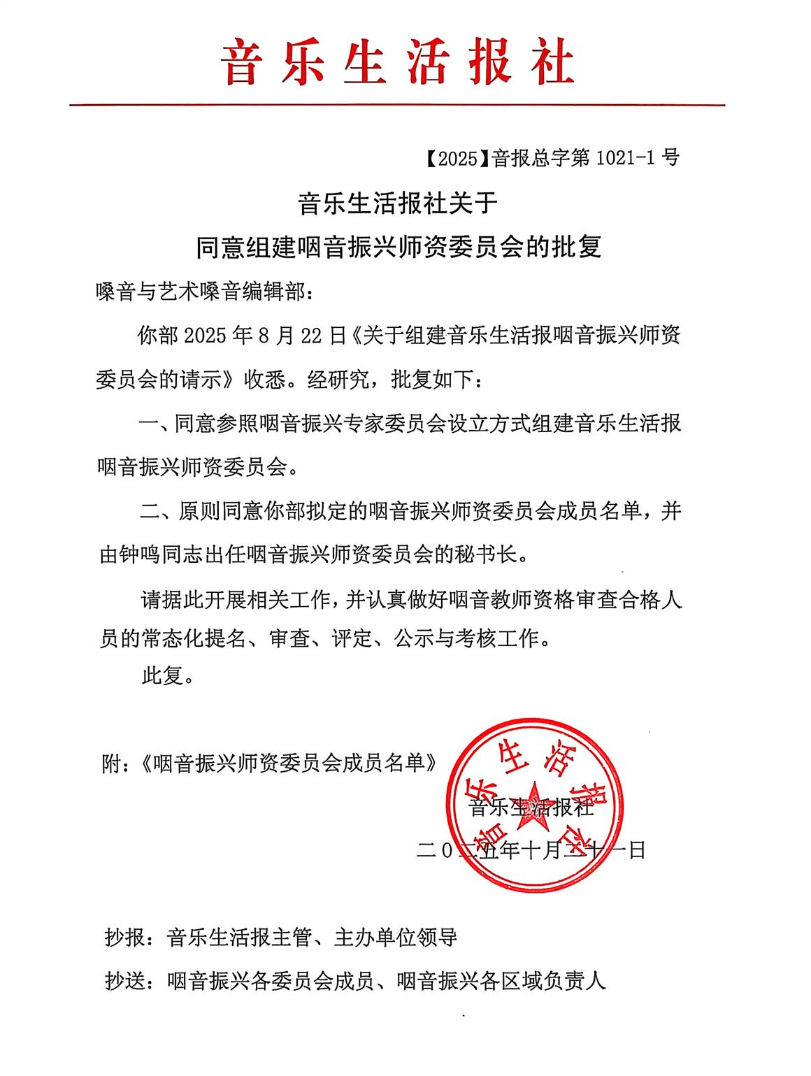 附件: 咽音振兴师资委员会成员名单主任委员: 田生玉 咽音振兴专家委员会主任委员、声乐教育家、西安音乐学院声乐系资深教授 谭丽娟 咽音振兴专家委员会主任委员、浙江省歌舞总团艺术指导、副团长,浙江省合唱协会名誉理事长 邓玉华 咽音振兴专家委员会副主任委员、中国煤矿文联音乐家协会原主席 副主任委员: 赵桂芳 咽音振兴专家委员会副主任委员、山东民歌传承与研究中心常务主任 闫世萍 咽音振兴专家委员会委员、中国艺术医学协会嗓音专业委员会常务理事 钟 鸣 钟振发咽音中心负责人、嫡传弟子,福建省歌舞剧院独唱演员 委员: 向 松 咽音振兴工作委员会副主任委员、四川音乐学院声乐教师 张善巧 原山东话剧团艺术嗓音言语医学研究室主任 赵凤鸣 咽音振兴工作委员会副主任委员、东莞市美益声乐传媒公司董事长 银 克 咽音振兴工作委员会副主任委员、原新疆博尔塔拉歌舞团声乐演员 闫廷玉 咽音振兴工作委员会副主任委员、抚顺市老年大学声乐教师 裴利伟 咽音振兴工作委员会副主任委员、河南百唱文化传播有限公司声乐讲师 曲 虹 咽音振兴工作委员会委员、莱阳市音乐家协会声乐专业委员会主任 秘书长:钟 鸣(兼) 副秘书长:王建松 张玉强 情况说明: (一)上述成员产生截止时间为2025年8月22日,其他成员仍在产生中; (二)上述成员的公示截止时间:2025年11月2日。 音乐生活报社 嗓音与艺术嗓音编辑部 2025年10月21日 | ||||