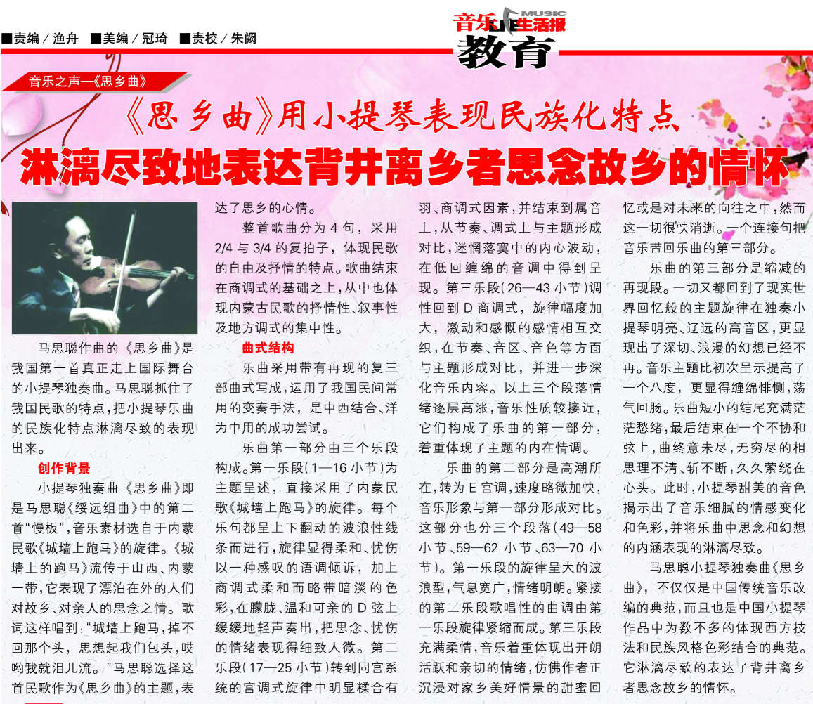 《思乡曲》用小提琴表现民族化特点 淋漓尽致地表达背井离乡者思念故乡的情怀